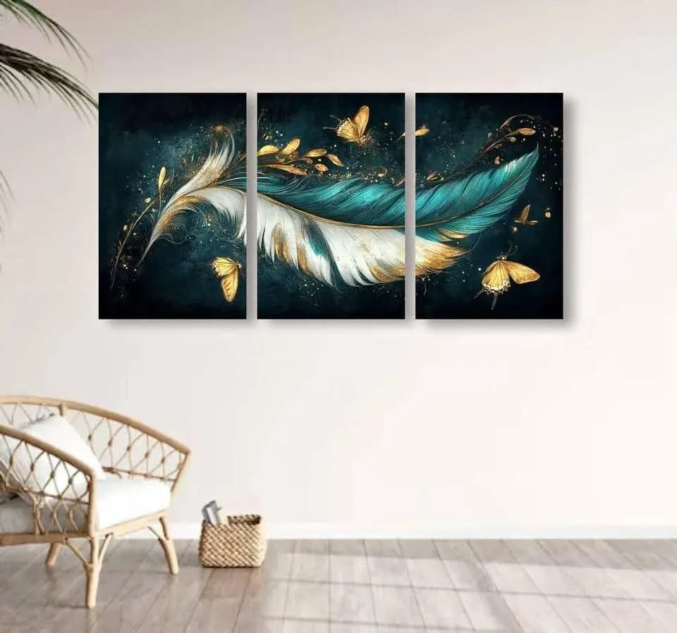 The Floating Feather Dream Teal and Gold Painting embodies the sense of movement and calmness by its flowing design of feather. The feather can be seen floating softly through the panels, with slight golden shades, which also add warmth to it, and produce a sense of luxuriousness.