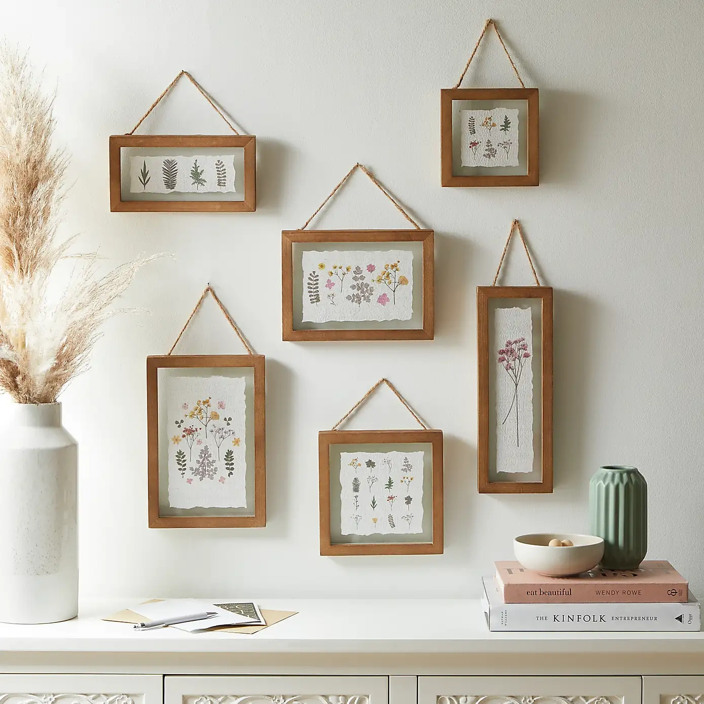 Decorate your space with this Set of 6 Pretty Boho Dried Floral Framed Prints. Featuring delicate botanical designs in natural wood frames, perfect for relaxed boho interiors. Shop now at Heart and Home.