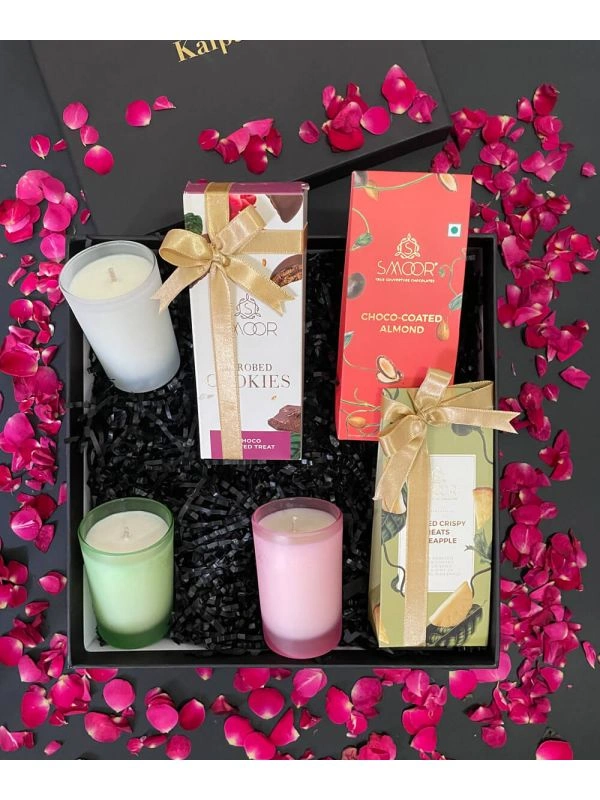 The Candle Gift Box is an elegant, luxurious gift set designed to offer relaxation and indulgence. It combines the calming effects of premium soy wax candles with delicious gourmet treats, including Choco Coated Almonds, Choco Covered Cookies, and Crispy Pineapple Treats. Perfect for any occasion, this beautifully packaged gift set creates a cozy, aromatic atmosphere while satisfying your sweet cravings.