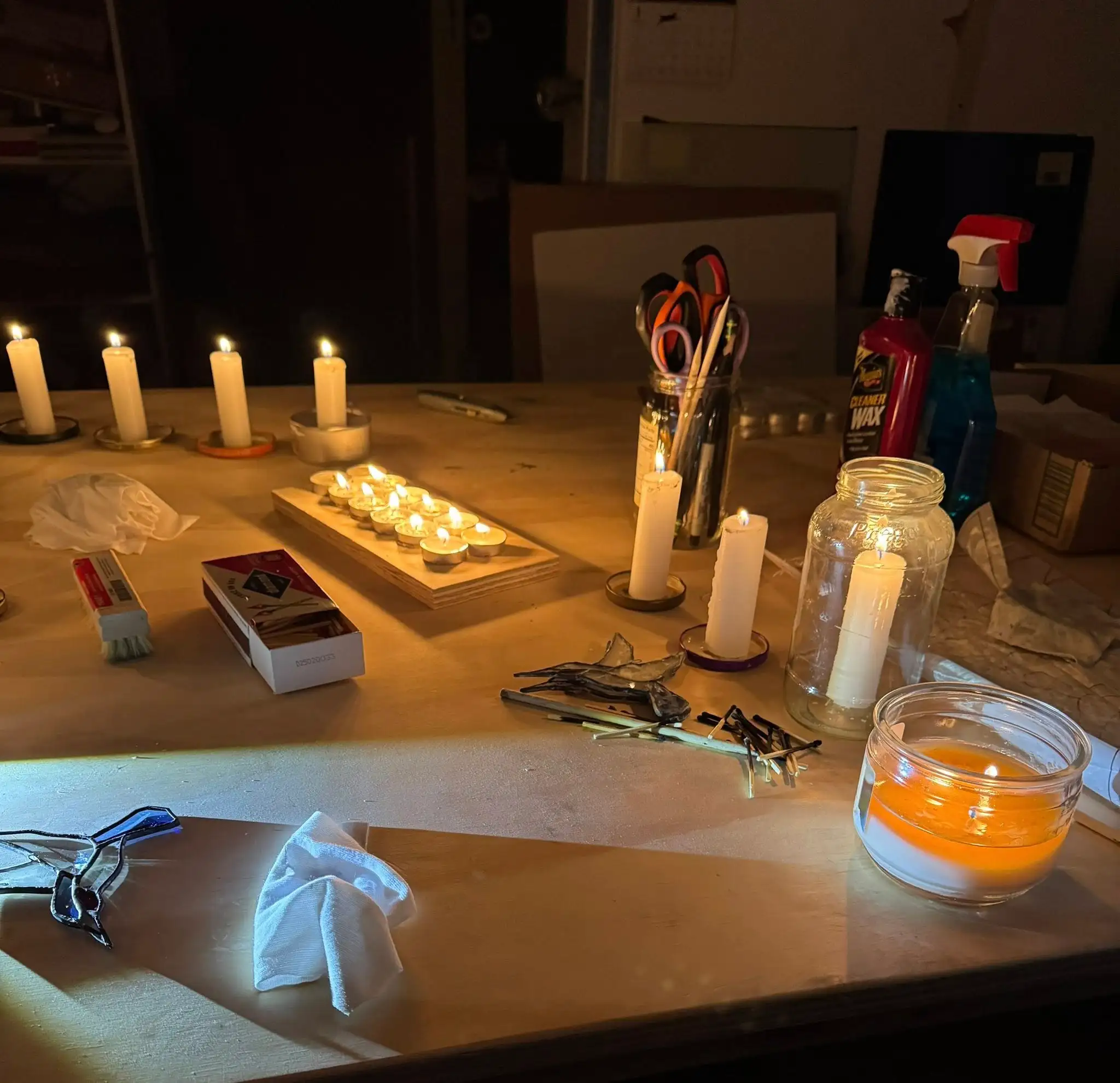 Warm Flame Candle captures a beautifully atmospheric moment of creativity powered entirely by candlelight. This artistic photograph showcases a worktable illuminated by warm, flickering candles, surrounded by everyday tools and materials. The soft glow highlights textures, shadows, and details, creating a moody, intimate scene that celebrates handmade art, patience, and calm focus. Ideal as wall art or a visual accent, this image brings warmth and authenticity into creative spaces.